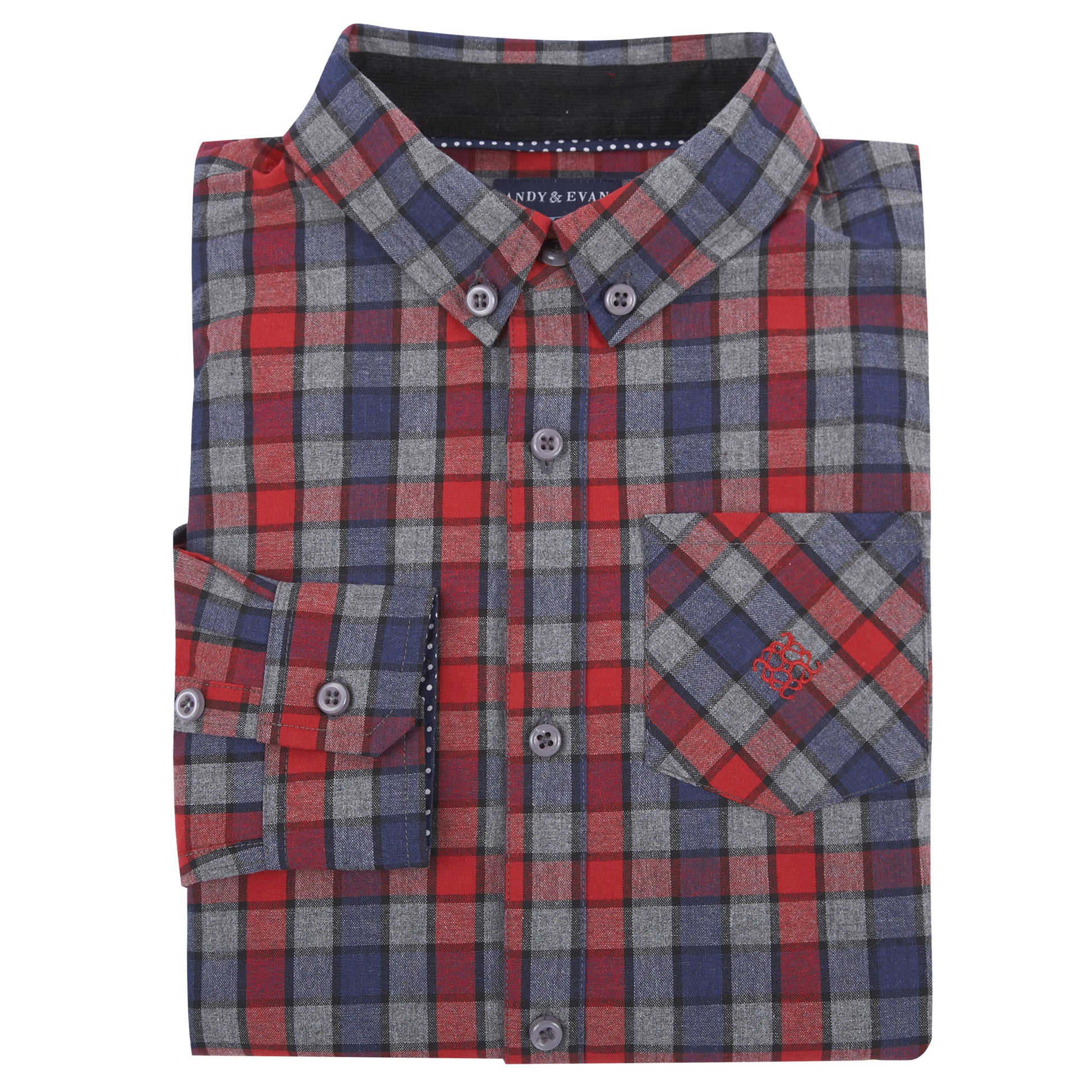 A soft grey flannel with pop of red & blue. It features black corduroy elbow patches and navy polka dot lining on the inside of the cuff.