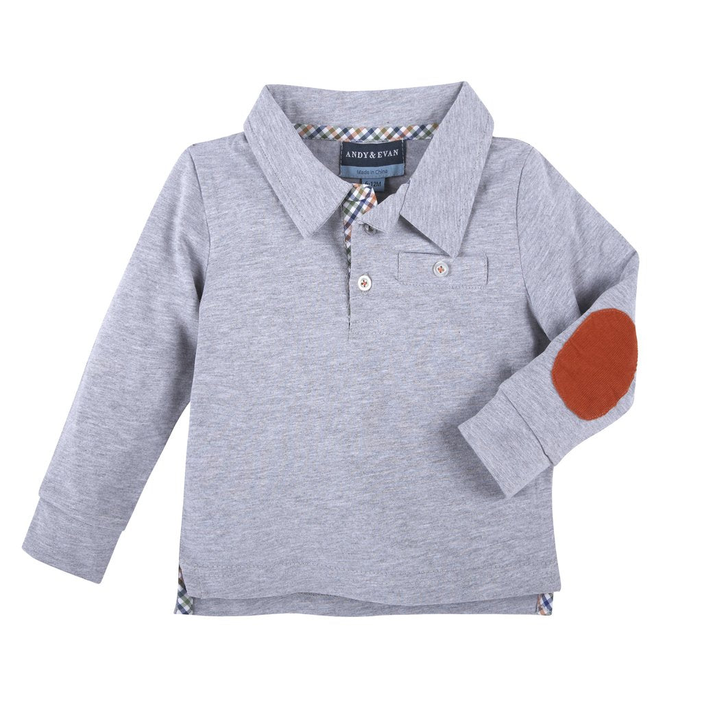 A soft classic grey polo with orange corduroy elbow patches for extra style. It also features a front pocket with a button closure.