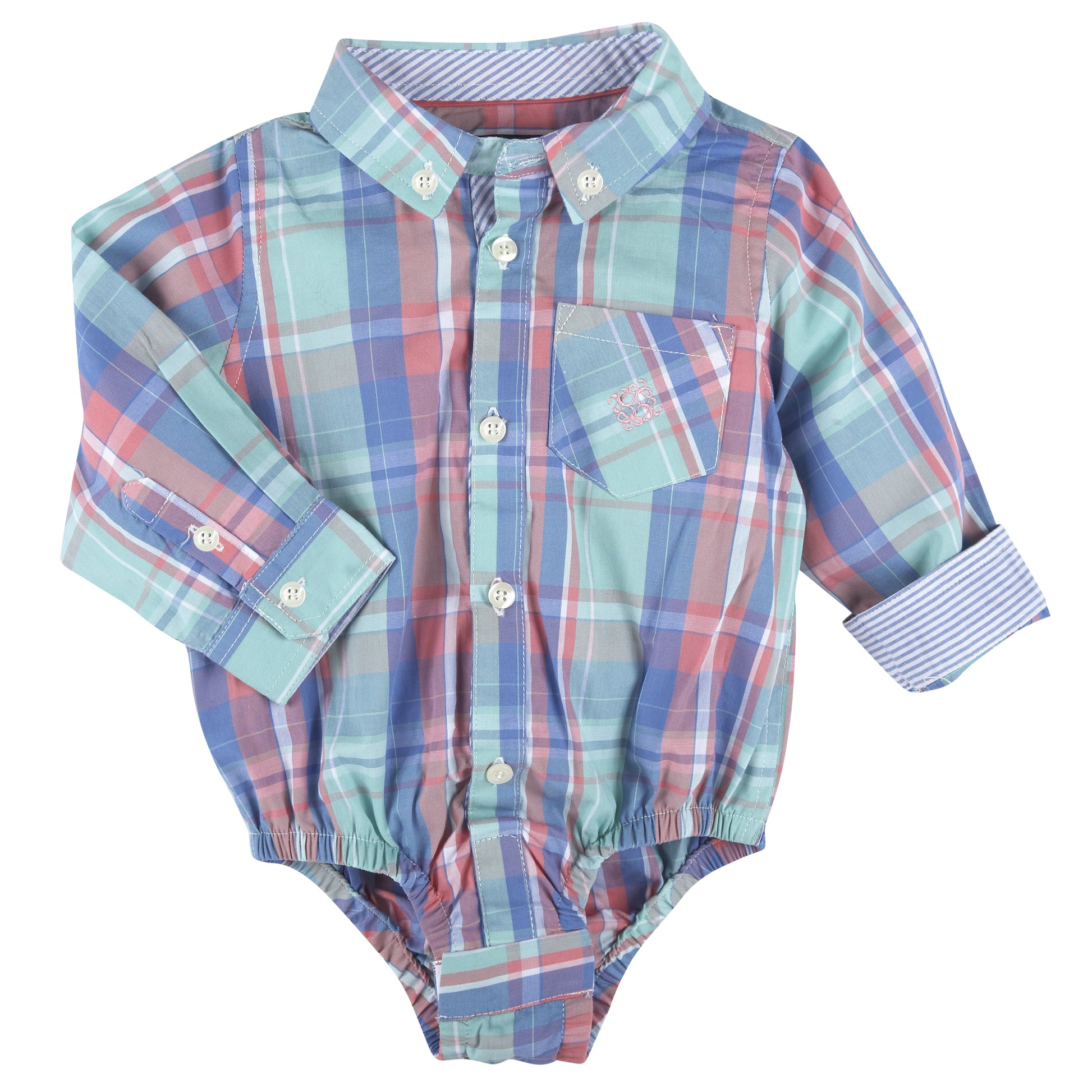 A mint green, light blue and coral button-up shirtzee that will have your littlest man looking dapper. The cuffs and collar are lined with light blue. It features elastic around the legs and hidden snap closure at the bottom.