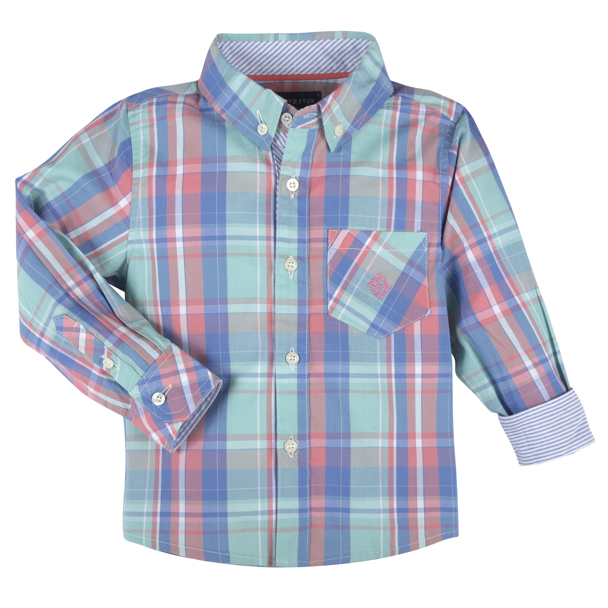 A lightweight mint green, light blue and coral plaid button-up that will have your little man looking dapper. The cuff and collar are lined with light blue.