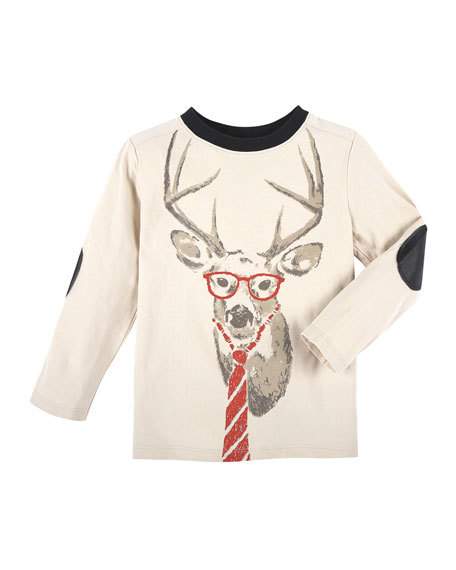 A festive t-shirt with a playful deer wearing red embroidered glasses and necktie. It also features black herringbone elbow patches on the sleeves.
