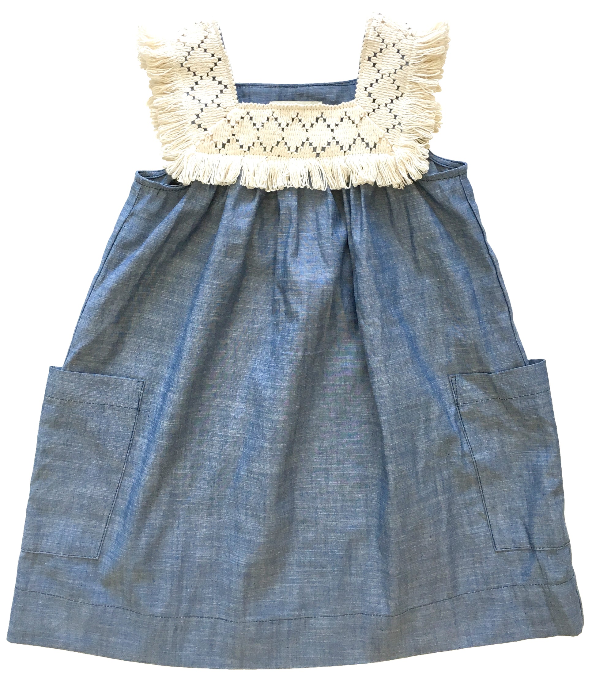 A chambray sundress that features outside pockets and a gorgeous crochet neckline. You little will be right on trend with the fringe detail.