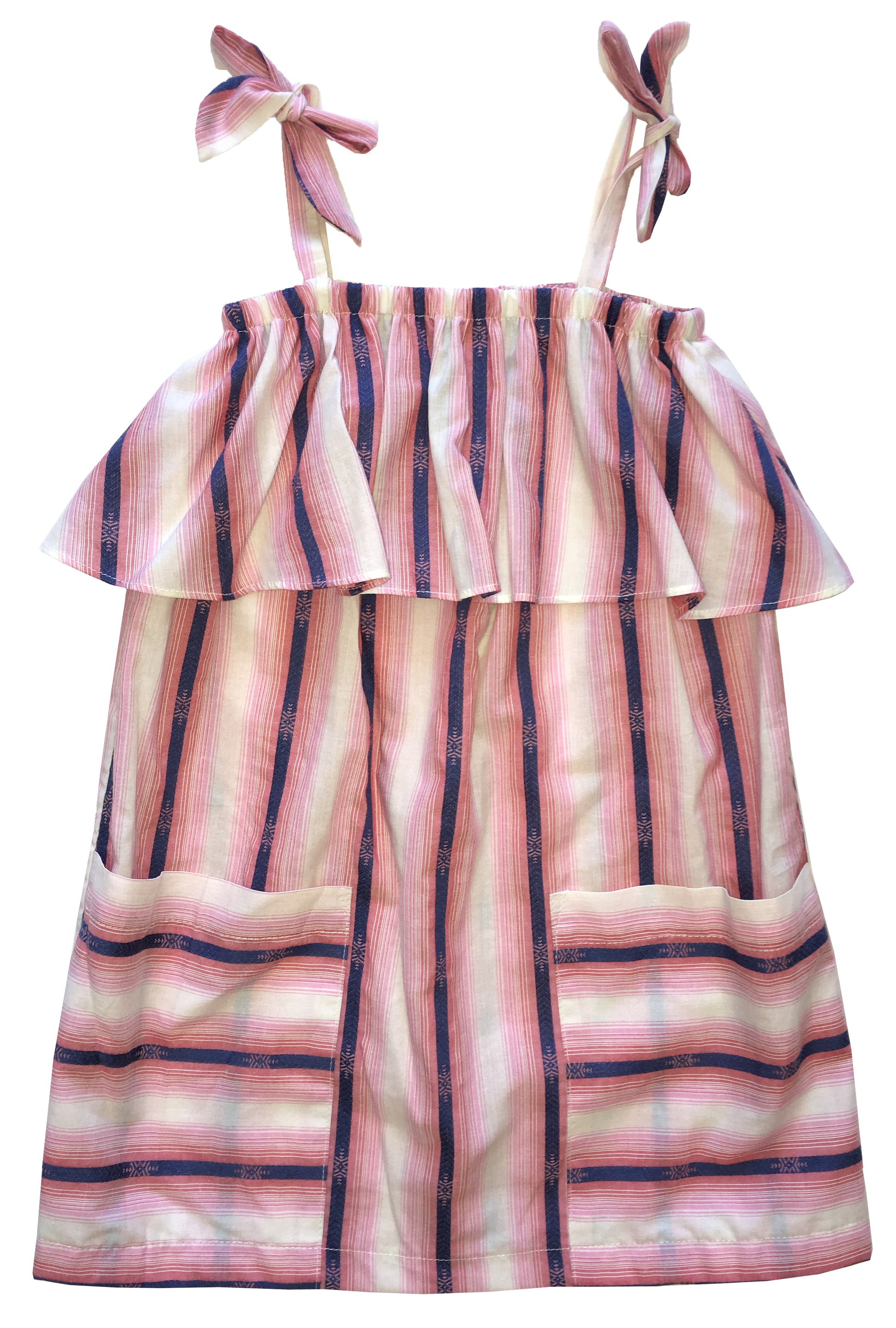 A lightweight 100% cotton sundress with a ruffle detail and functional ties at the top. It also features large pockets on the front that are perfect for carrying treasures.