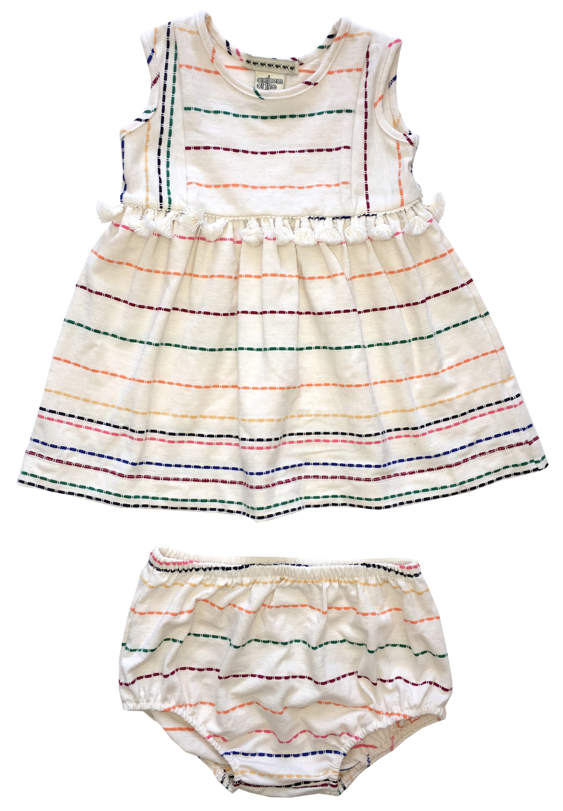 This colorful dress comes with matching bloomers. It features a tassel detail that wraps around the back.