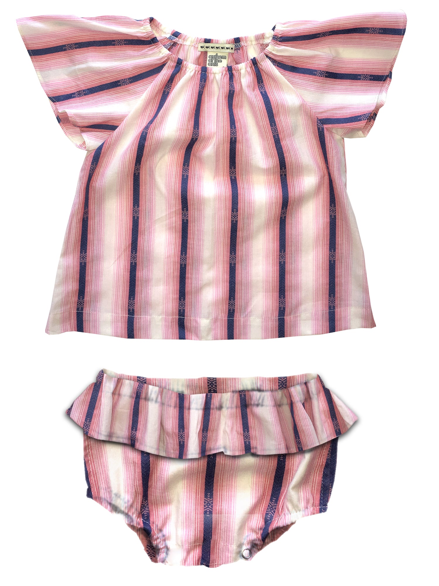 A gorgeous lightweight 2 piece set with an elastic neckline and ruffle sleeves. The bloomers feature a ruffle detail around the waist.