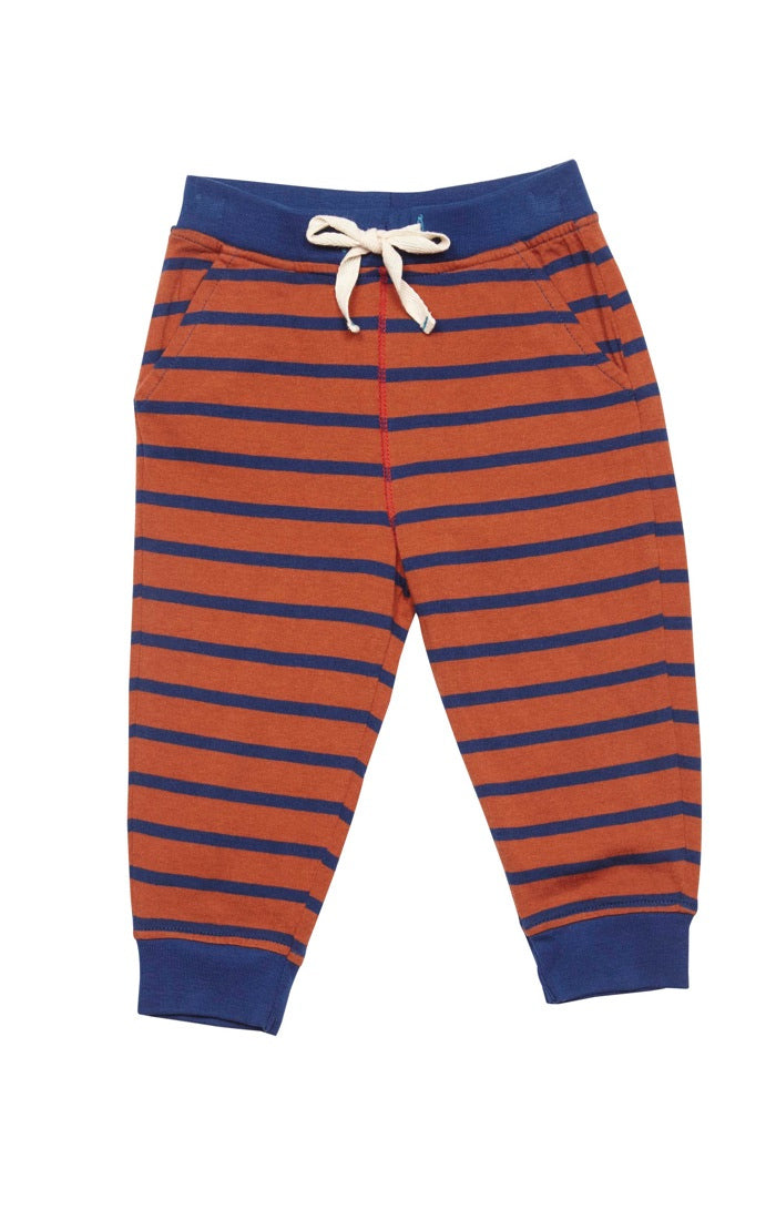 A super soft burnt orange & navy striped pant. Features contrast trim at the waist and leg as well as a contrast stripe back pocket. There are 2 front pockets and a full elastic waistband with faux drawstring. Pairs perfectly with the Henry Tee.