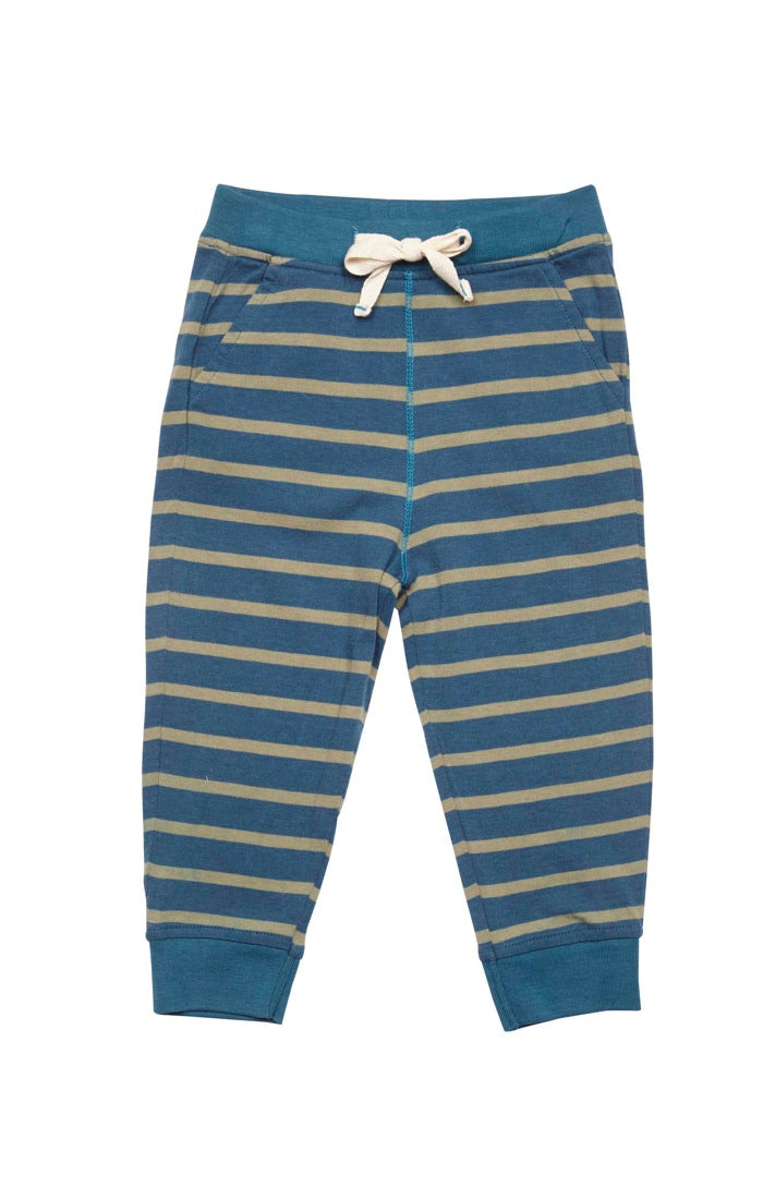 A super soft olive green & blue striped pant. Features contrast trim at the waist and leg as well as a contrast stripe back pocket. There are 2 front pockets and a full elastic waistband with faux drawstring. Pairs perfectly with the Henry Tee.