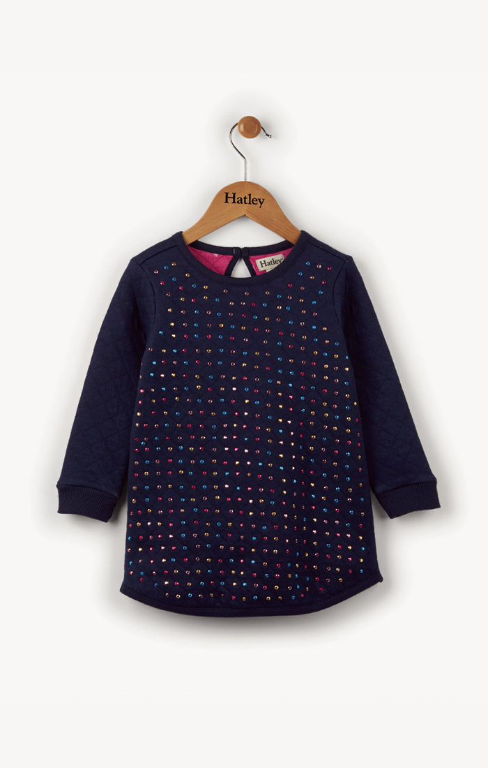A gorgeous navy quilted dress with metallic confetti pearl detail. Can be worn as a dress or as a tunic over leggings as your little grows. The cute Hatley details continue with the heart print lining on the inside.