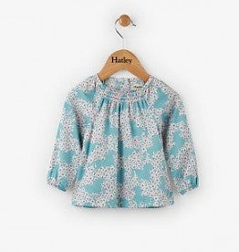 A floral smocked tunic with elastic sleeves. It features buttons along the back for a sweet detail. Pairs perfectly with our Hatley Pink Leggings.