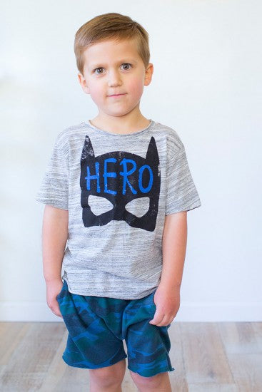 Lightweight comfy knit shorts that will be perfect for playtime. They have a faded blue camo print with an elastic waist.