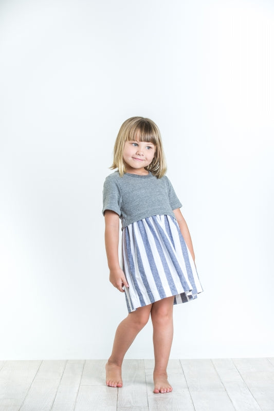 The top is a grey knit and a chambray striped skirt. Made in the USA.