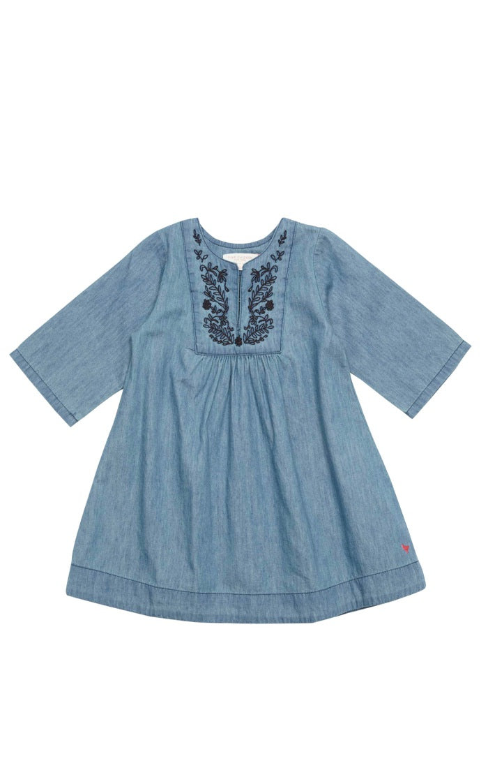 A soft classic chambray dress with gorgeous navy embroidery. Navy stitching around the sleeve and hem.