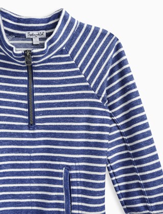 A striped french terry pullover with 1/4 zipper. It also has 2 pockets in front that are perfect for carrying toys.