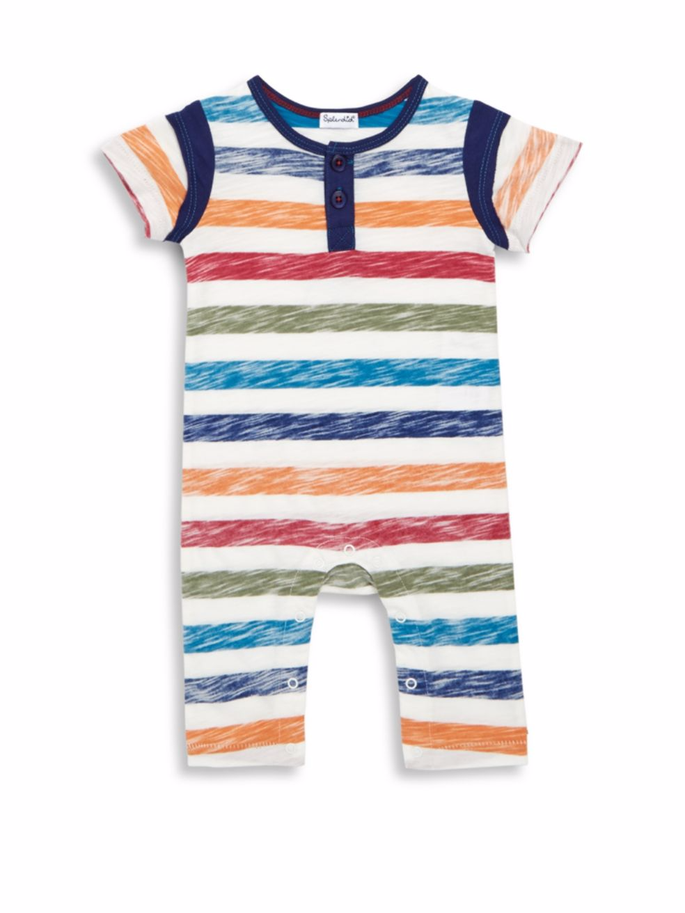 A super soft striped coverall for your little man. It features henley style buttons and snap closure at the bottom for easy on and off.